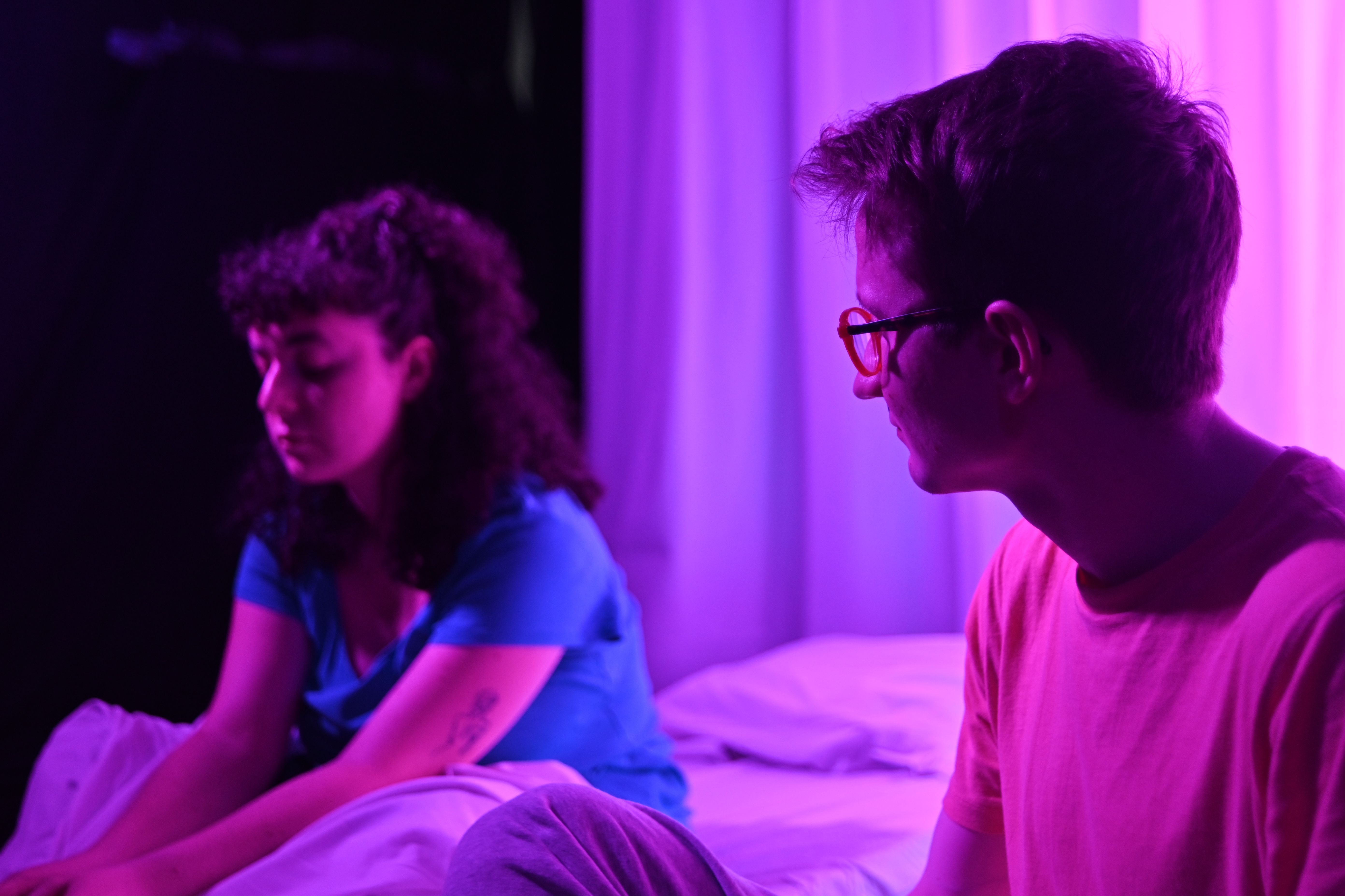 Ils se rencontrent de nuit, dans une chambre d’hôpital qu’ils doivent partager par manque de lits. Ils sont adolescents. Elle parle beaucoup, trop. Les mots forment comme un socle sous ses pieds : si elle ne parle pas, elle n’existe pas. Lui, n’a pas de mots. Il pense en brouhaha et il est cloué au sol par ses bras trop lourds. Deux folies qui se rencontrent, qui se racontent, et une nuit pour se sauver la vie.